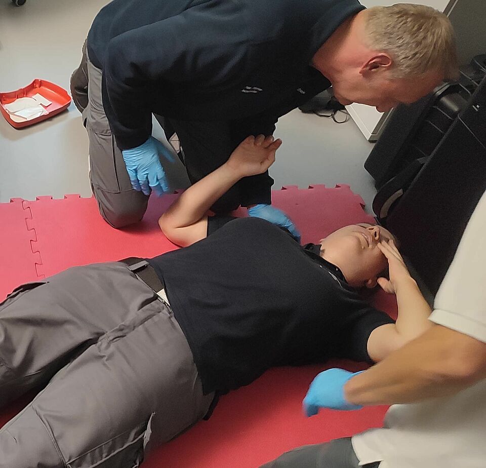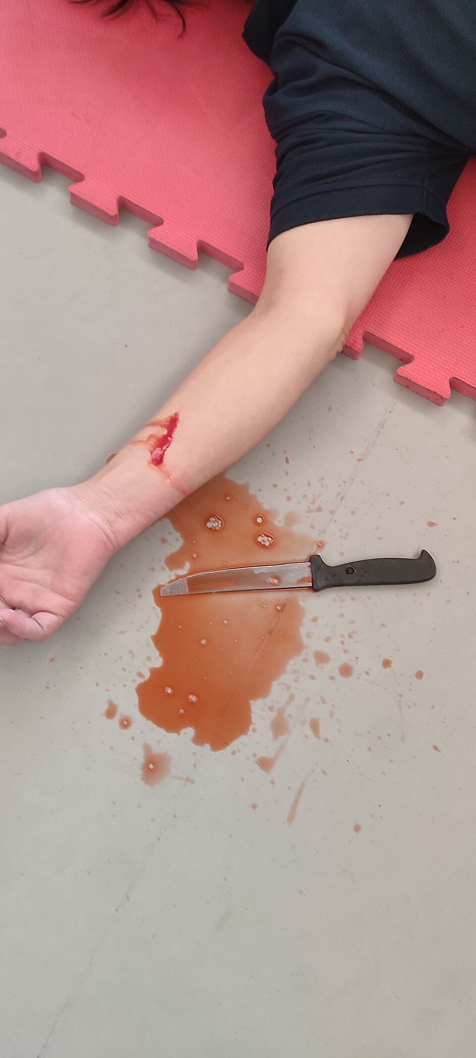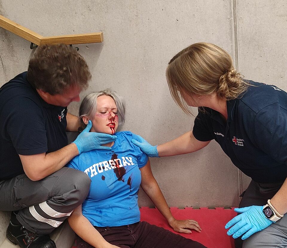 Um es möglichst realistisch zu gestalten, wurden die Darsteller*innen fantastisch geschminkt und vorab in den Fall eingewiesen. Unsere DRK'ler mussten dann die gelernten Strategien direkt anwenden und umsetzen, kamen aber auch öfter mal aus der Puste. Gelacht haben wir aber auch sehr viel.